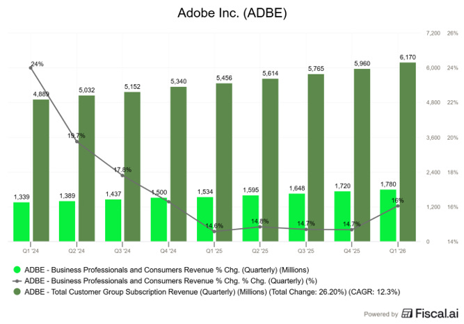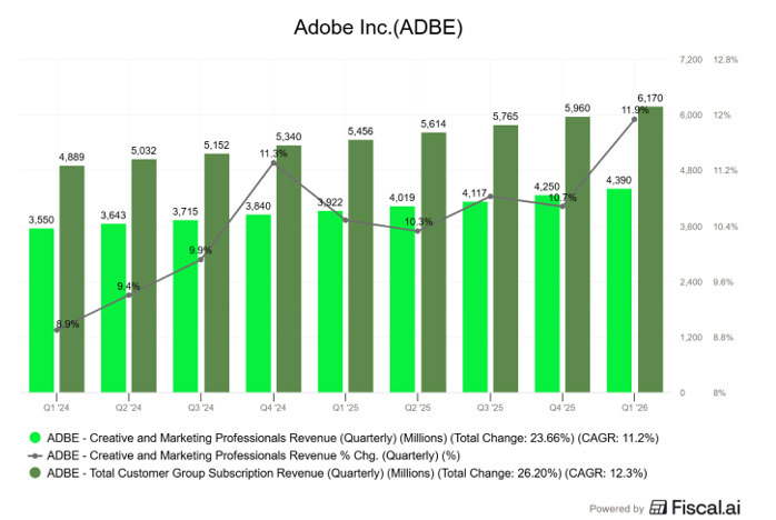 Adobe reports two customer subscription groups. Both delivered strong double-digit growth in Q1 FY26: