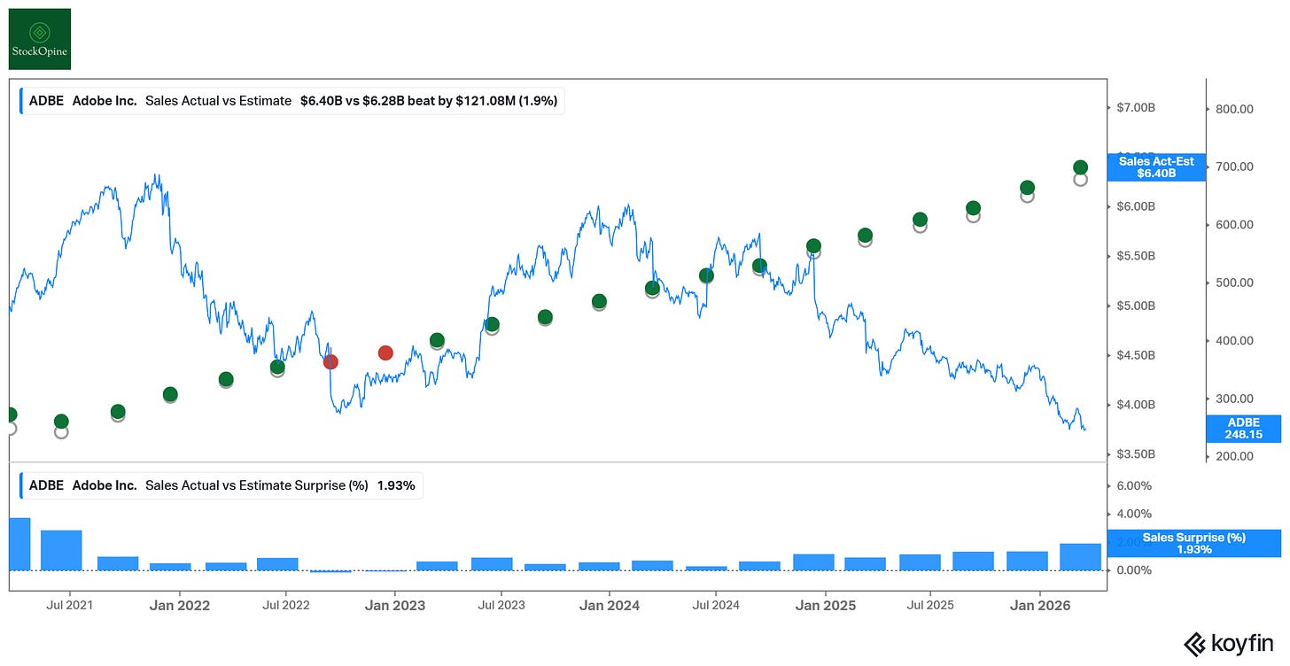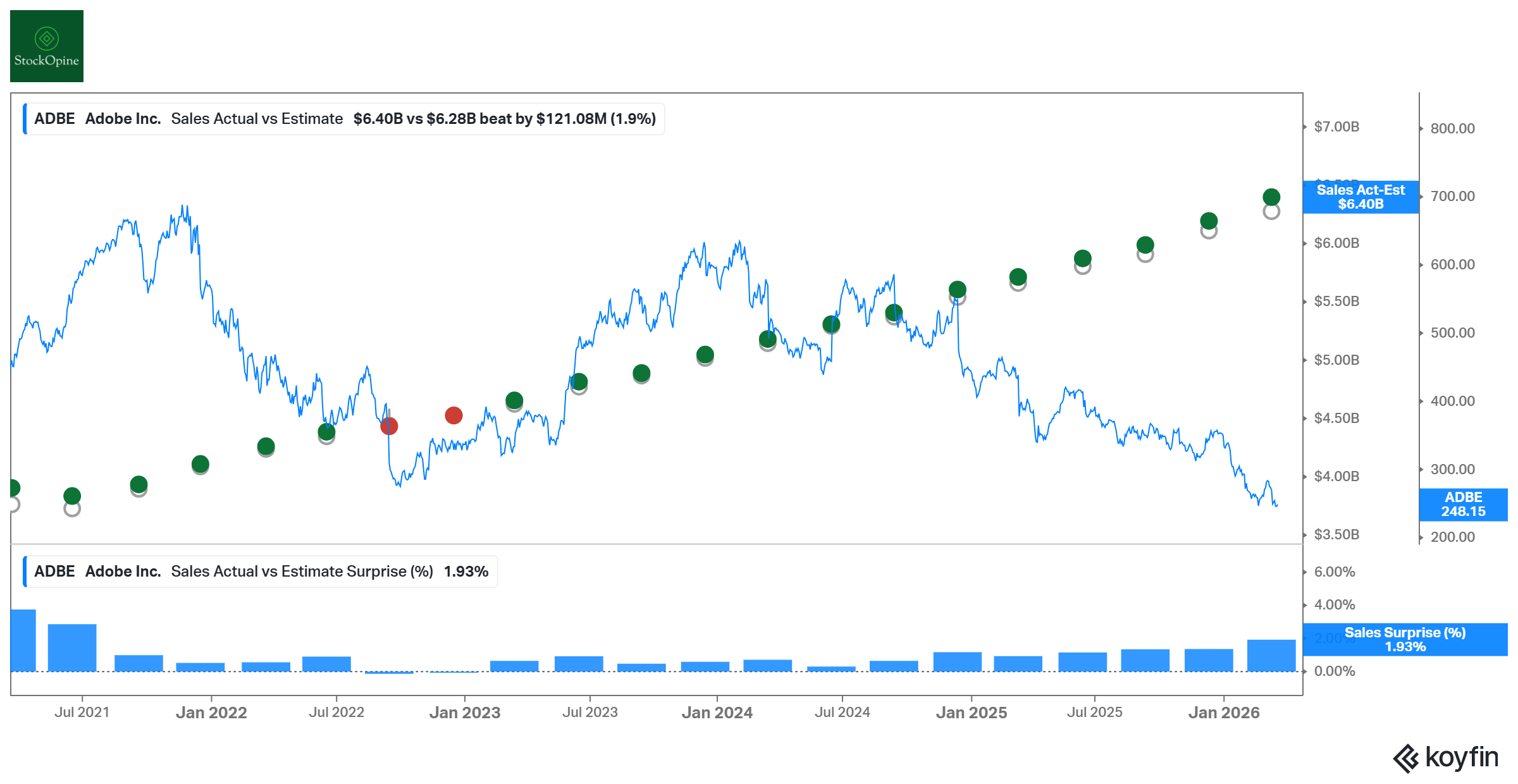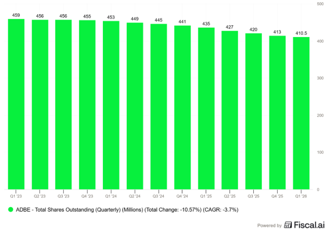 Adobe has also extended its run of earnings & sales beats over the past 5 years (it only missed sales consensus twice) by continuing to grow revenue and profitability at a consistent rate. The earnings beat magnitude has widened over the past three quarters driven both by performance and by the aggressive buyback program, reducing shares outstanding from 435 million in Q1’25 to 410 million in Q1’26 .
