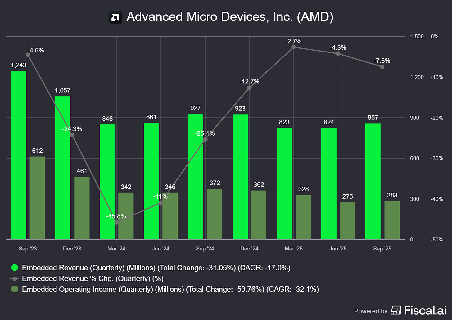 The Embedded segment revenue was $857 million, down 8% year-over-year, as the market continues to correct. However, the segment showed signs of strengthening, with revenue growing 4% sequentially. Operating margin declined to 33% from 40% last year due to product mix. Despite the near-term cyclical weakness, the design-win pipeline remains exceptionally strong, with AMD on track for a second straight year of record design wins already totaling more than $14 billion year-to-date.