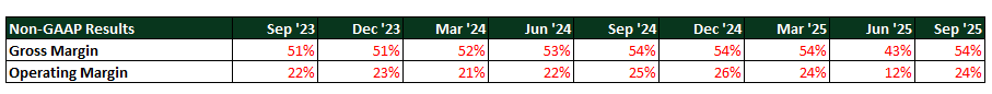 Non-GAAP gross margin is guided to be approximately 54.5%. The company also guided for non-GAAP operating expenses of approximately $2.8 billion, implying a non-GAAP operating margin of approximately 25%, a one-percentage-point improvement over Q3’25.