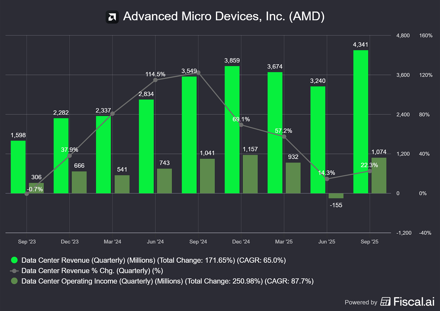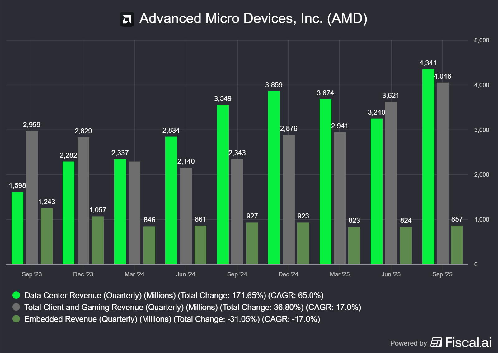 AMD’s Q3 results were a strong beat, demonstrating the strength in its core CPU businesses, which hit all-time records. While the Embedded segment is still navigating a cycle, the AI accelerator business just received its ultimate validation. The strategic partnerships with OpenAI and Oracle is validating AMD’s strategy in an effort to get a higher share from Nvidia’s pie (Nvidia reported $41B revenue from its data center segment in the latest quarter compared to $4B for AMD).