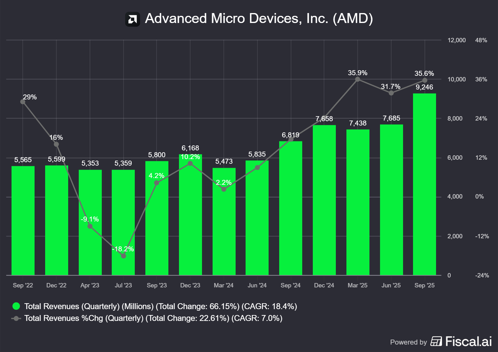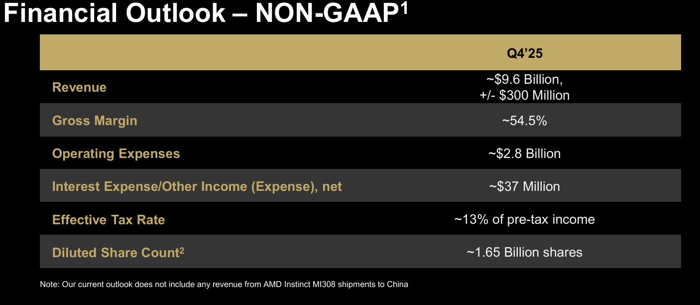 For the fourth quarter of 2025, AMD expects revenue to be approximately $9.6 billion (+/- $300 million), implying 25% year-over-year growth at the midpoint.