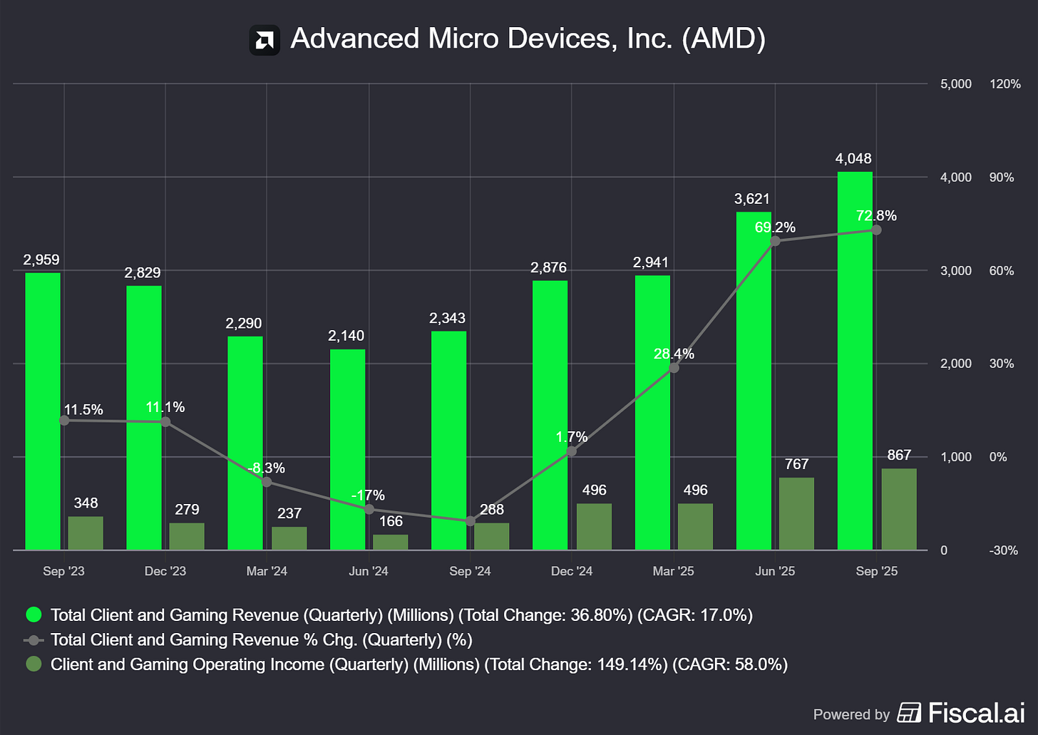 The combined Client & Gaming segment reported a record $4.0 billion in revenue, up 73% year-over-year. Operating income surged to $867 million, reflecting a 21% operating margin, an expansion from 12% last year.