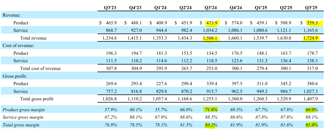 Gross Margin: Non-GAAP Gross Margin was 81.6%. While strong, this was down from 83.2% in Q3’24 , reflecting a lower product gross margin (68% in Q3’25 vs 71.6% in Q3’24) and a mix shift towards product revenue (32% in Q3’25 vs 31% in Q3’24). That said, margin was significantly higher than the guidance of 80.5% due to improved cost control.