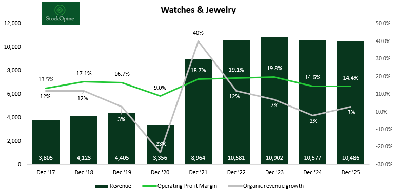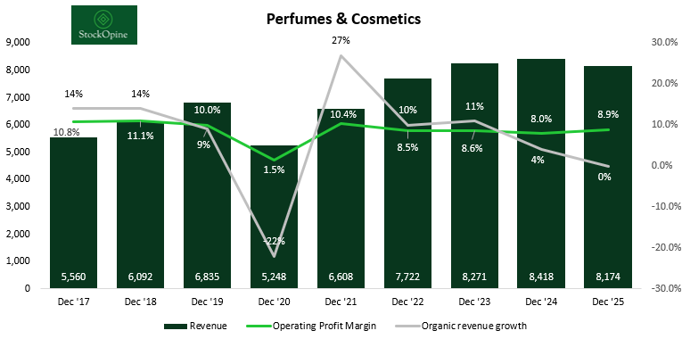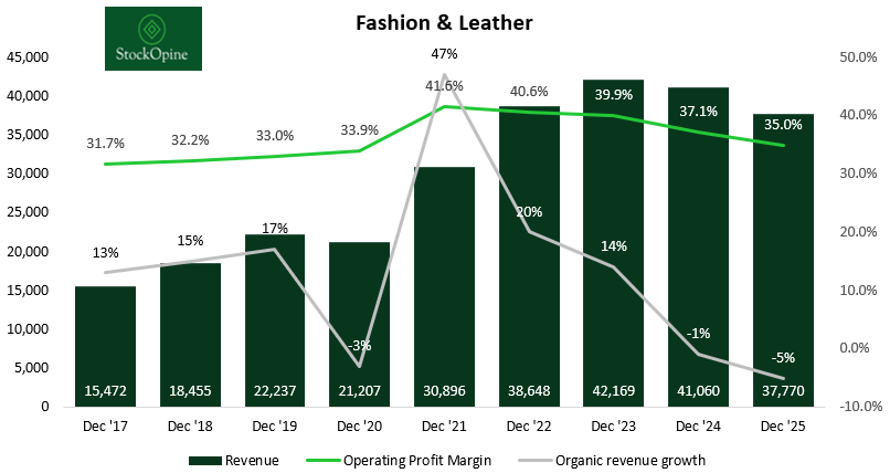 DFS: LVMH is actively exiting this business, having sold a majority stake to focus on more profitable ventures. DFS accounted for 1.8% of LVMH’s total revenue in FY25.