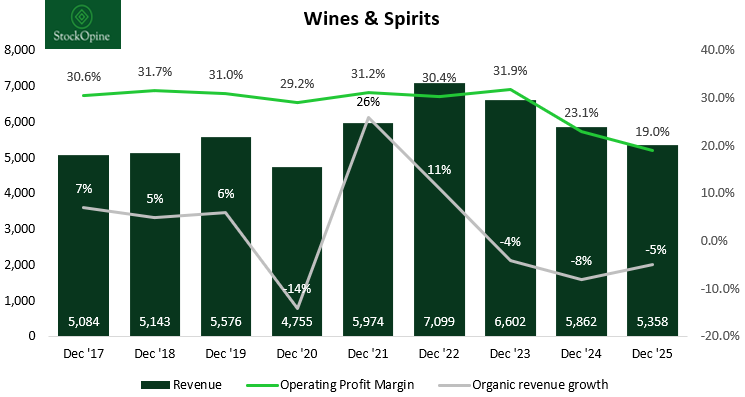 Cyclical normalization: Following the post-COVID boom, demand has softened, particularly in Wines & Spirits.