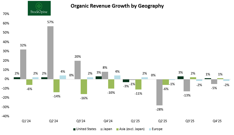 Despite a negative full-year organic print (-1%), momentum shifted positively in the second half of the year. H2 organic growth rebounded to +1%, signaling a potential stabilization.