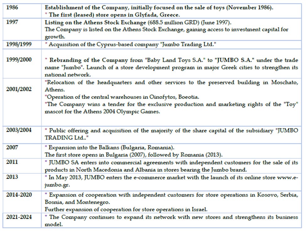 Description: Jumbo S.A. (Ticker: BELA - “Jumbo”, “Company”) is a leading diversified retailer known for its affordable pricing and broad product offering, primarily focused on toys, baby products, stationery, seasonal items, and home goods. The Company offers over 40,000 SKUs and operates 89 owned/leased stores across Greece, Cyprus, Bulgaria and Romania, and has presence in North Macedonia, Albania, Kosovo, Serbia, Bosnia, Montenegro and Israel through 40 franchised stores operating under the JUMBO brand.