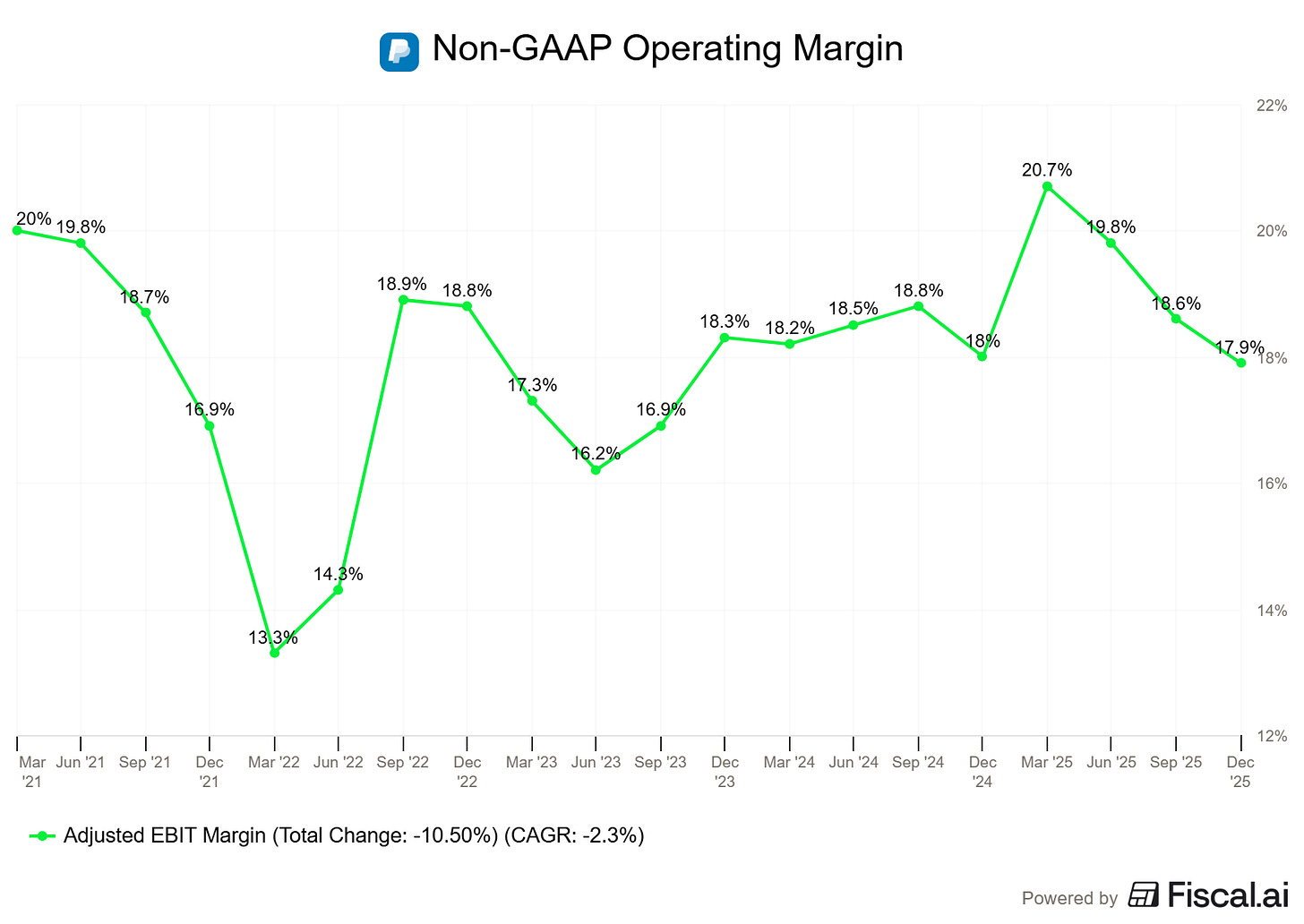 The shocker of the Q4 print wasn’t just the earnings miss, it was the abrupt, “effective immediately” appointment of Enrique Lores (former HP CEO) as the new President and CEO. This feels wrong. It feels reactive. While Alex Chriss may have missed on the core checkout button, he improved Braintree profitability, finally started monetizing Venmo, and stabilized the ship.
