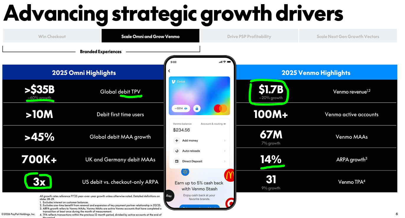 “These 2 businesses [Venmo and Enterprise] were once small contributors to profitability. In 2025, they drove nearly half of our 6% transaction margin dollar growth.”