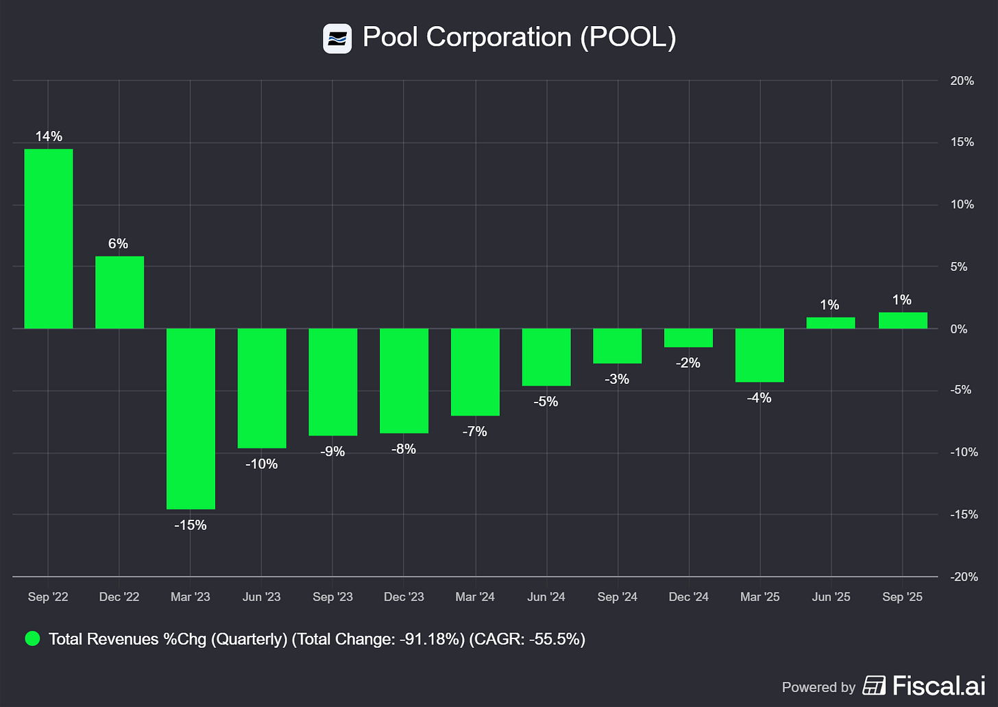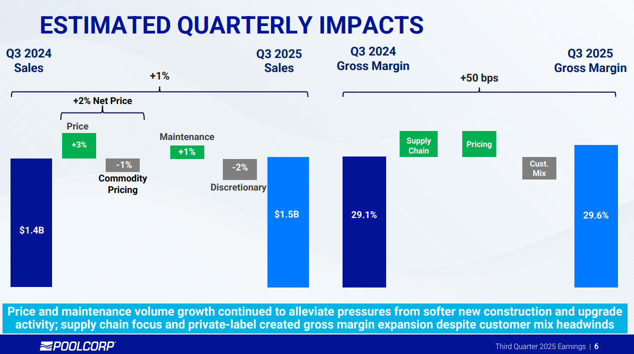 POOL reported third-quarter 2025 results that continued the stabilization trend we saw in Q2. The operating environment remains challenging, with elevated interest rates weighing on high-ticket discretionary spending. However, the non-discretionary maintenance business provided a solid foundation, and the company delivered another solid performance.