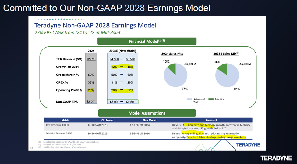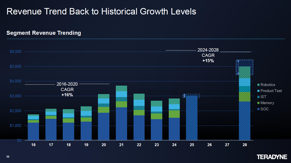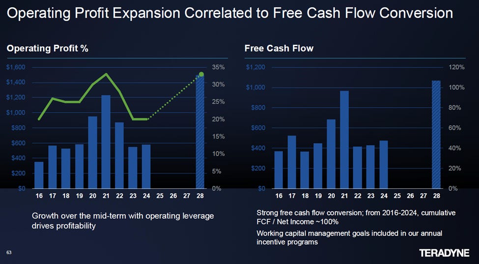 For context, the following slides, shared during the March 2025 Analyst Day, outline Teradyne’s growth expectations, including a 15% revenue CAGR, operating margins exceeding 30%, and free cash flow projected to surpass $1 billion by 2028.