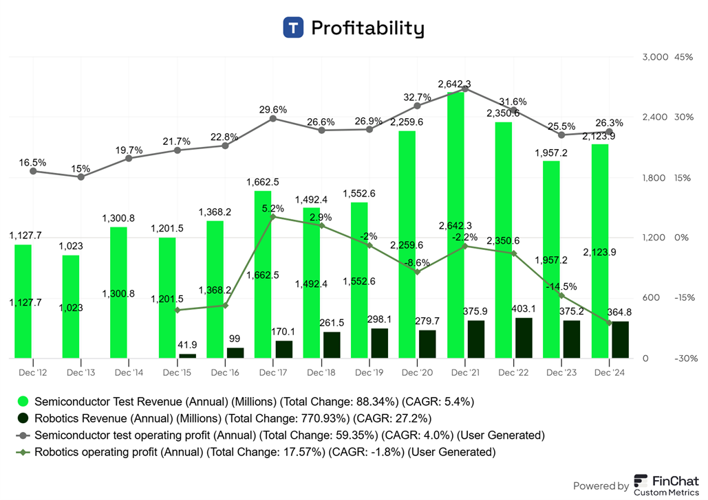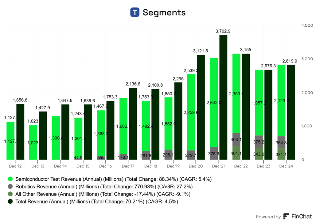 Source: FinChat.io (affiliate link with a 15% discount for StockOpine readers) / Note: In Q4 2024, Teradyne consolidated its segment reporting into two groups —> Semiconductor Test and Robotics & Other. Historical comparisons may vary.