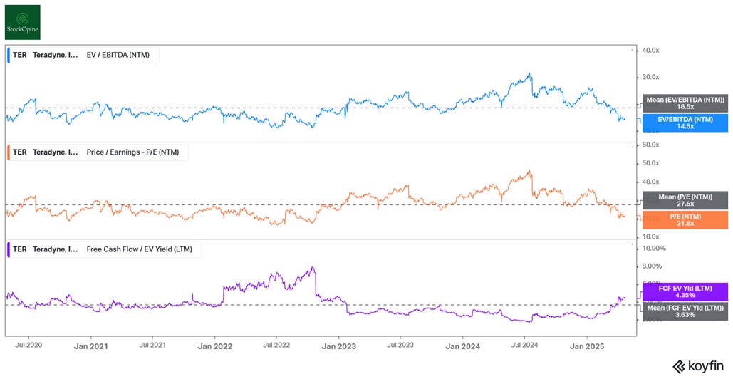 While these multiples don’t scream "cheap" for a company like Teradyne with consistently strong returns on capital, a dominant position in ATE, and long-term optionality through robotics, trading at market-average multiples appears conservative.