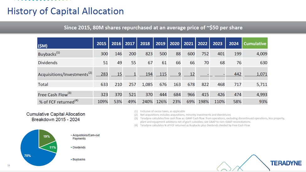 The company continued share repurchases under a $2 billion program announced in January 2023, buying back $199.4 million in 2024 at an average price of $114.63 (Vs $400.5 million in 2023 at $102.50). Meanwhile, it plans to repurchase $400 million in 2025. Teradyne also pays a $0.12 quarterly dividend, yielding 0.69%. Through 2015 to 2024, 93% of free cash flow was returned to shareholders. Notably, share repurchases totaling $4.0 billion over this period resulted in a one-third reduction in shares outstanding; an aggressive capital return strategy often seen in so-called "capital cannibals".