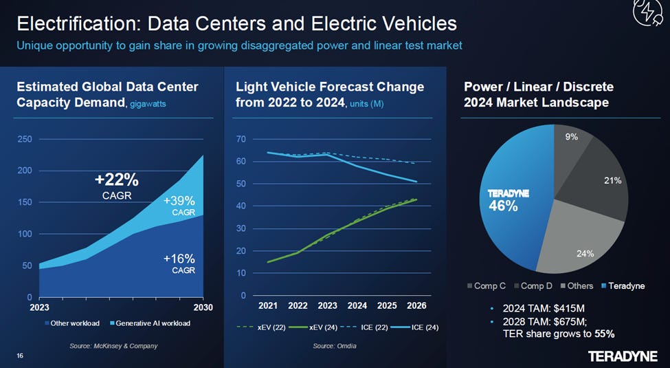 The third chart brings it all together; Teradyne’s Power/Linear and Discrete segment. From a 46% share in a $415M TAM, Teradyne aims to grow to a 55% share in a $675M TAM, reinforcing the long-term growth potential in electrification-linked testing solutions.