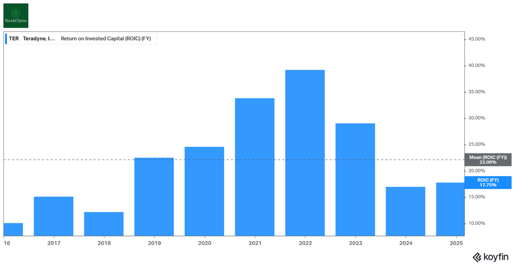 Teradyne has consistently delivered high ROIC through the cycle. For the twelve months ending December 2024, ROIC was 17.8%, down from its 2021 peak of 39.2%, but still above the PHLX Semiconductor Sector average of 17.1%. The company’s five-year average ROIC from 2020–2024 stands at approximately 27.3%.