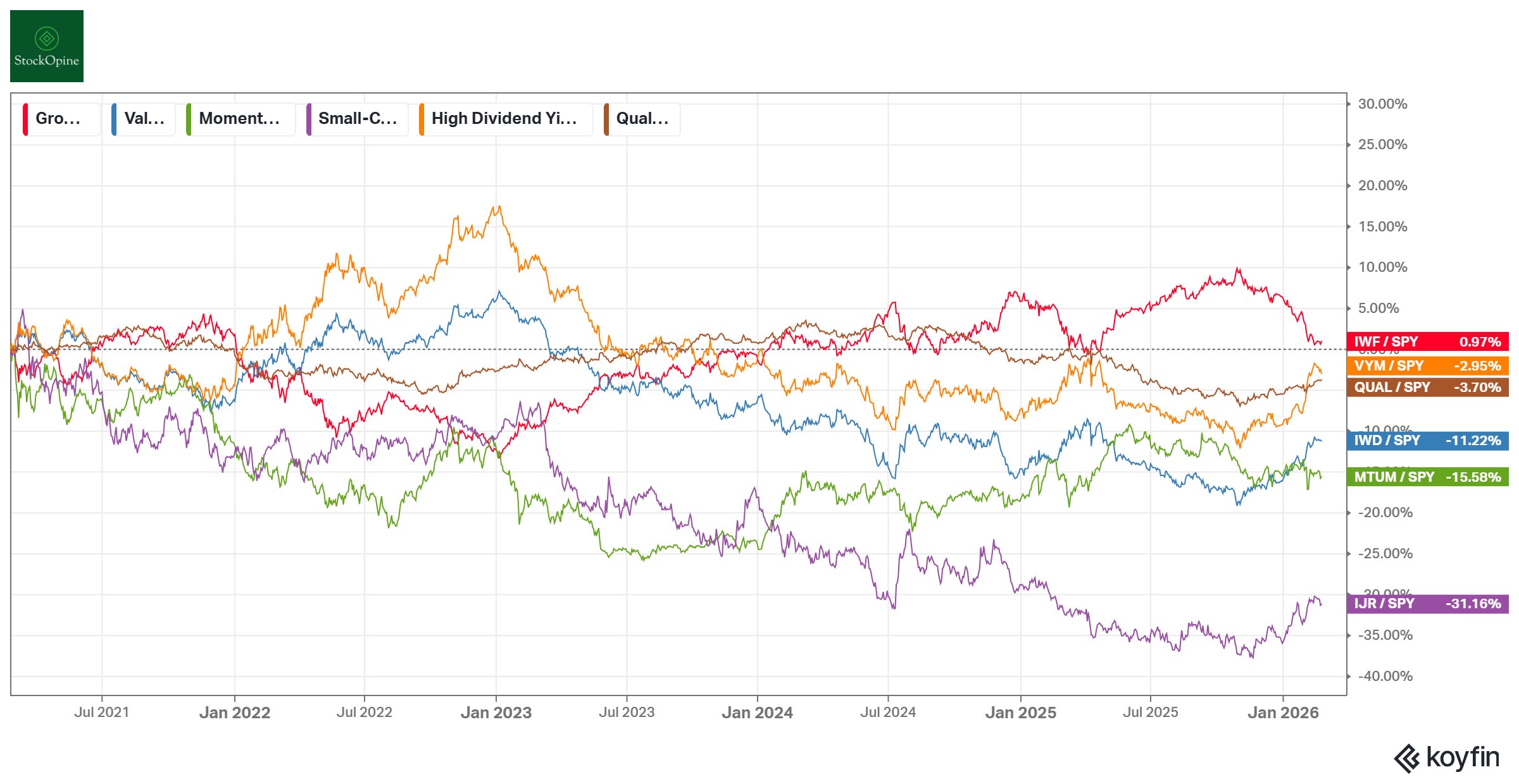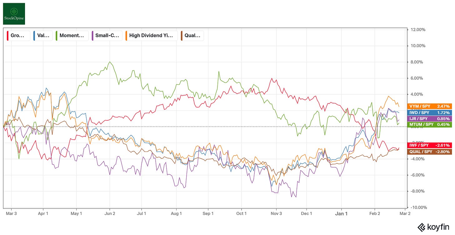 As illustrated by the Koyfin charts below showing various factor ETFs against the S&P 500 (SPY) over 10-year, 5-year, and 1-year horizons, no single strategy wins all the time. Growth dominates over the decade, but value and momentum have their distinct periods to shine. Because the market tide shifts, picking the right winners and managing their weight in the portfolio is important.