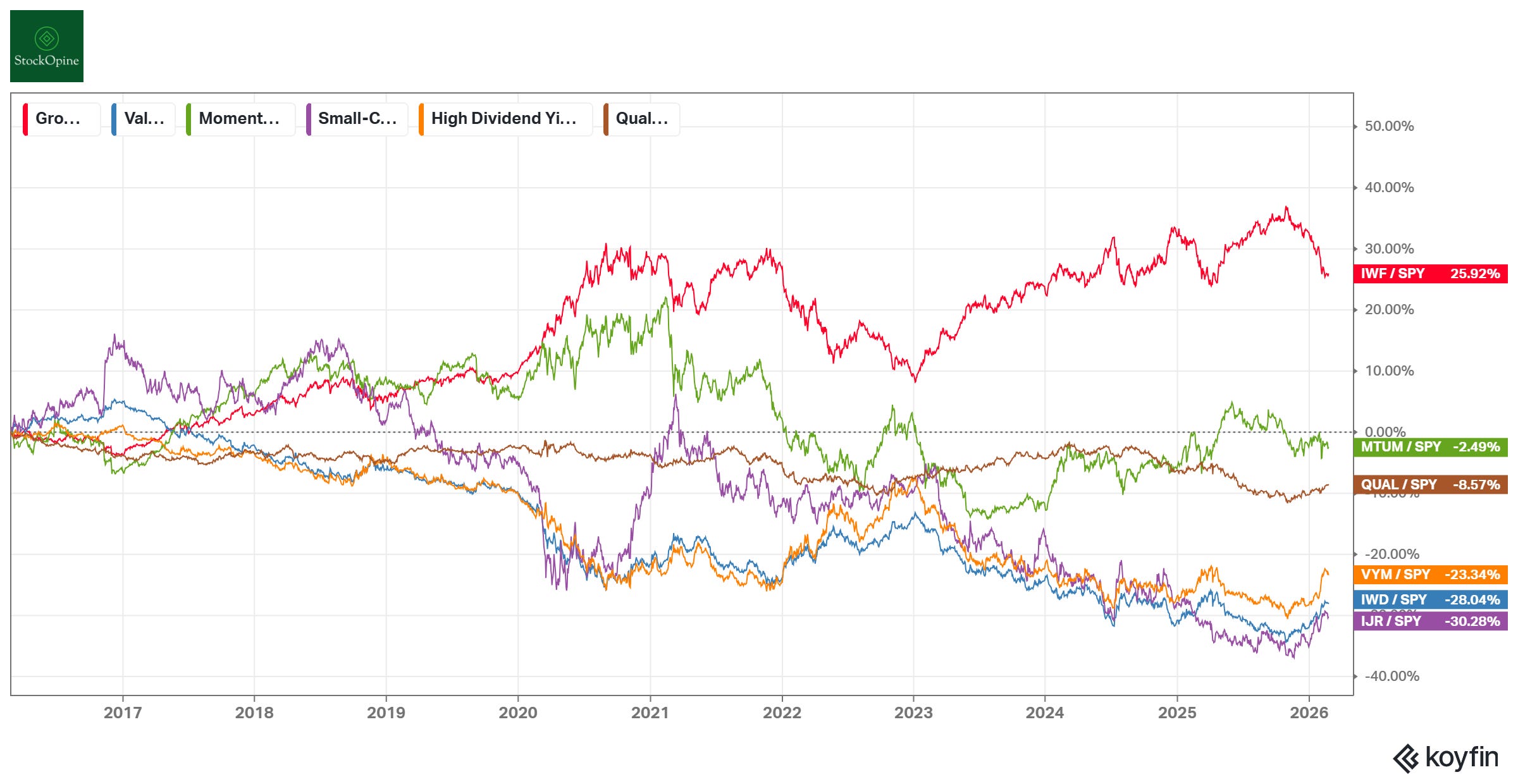 Over the last decade, Growth (IWF) has significantly outperformed, while small-caps and value have lagged.